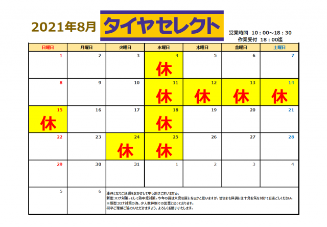 こんにちは、タイヤセレクト上越です。 毎度ご利用いただきありがとうございます。 当店は誠に勝手ながら8月11日から15日まで夏季休業とさせていただきます。 16日から平常通り営業致します。 お客様には大変ご不便お...