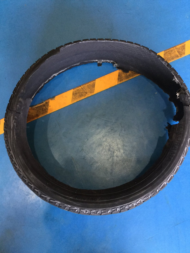 こんにちは。タイヤセレクト上越です。 毎度ご利用ありがとうございます。 今回バーストしたタイヤをご覧いただき、タイヤ点検の重要性をご理解頂ければ幸いです。 下の写真がバーストしたものです。 ひび割れから最悪...