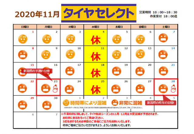 ★いつもタイヤセレクト上越をご利用頂き、ありがとうございます★ 11月は毎週水曜日が定休日となります。 冬タイヤの商談、履き替えでご来店されるお客さまが多くなってきました!! 今シーズンは...