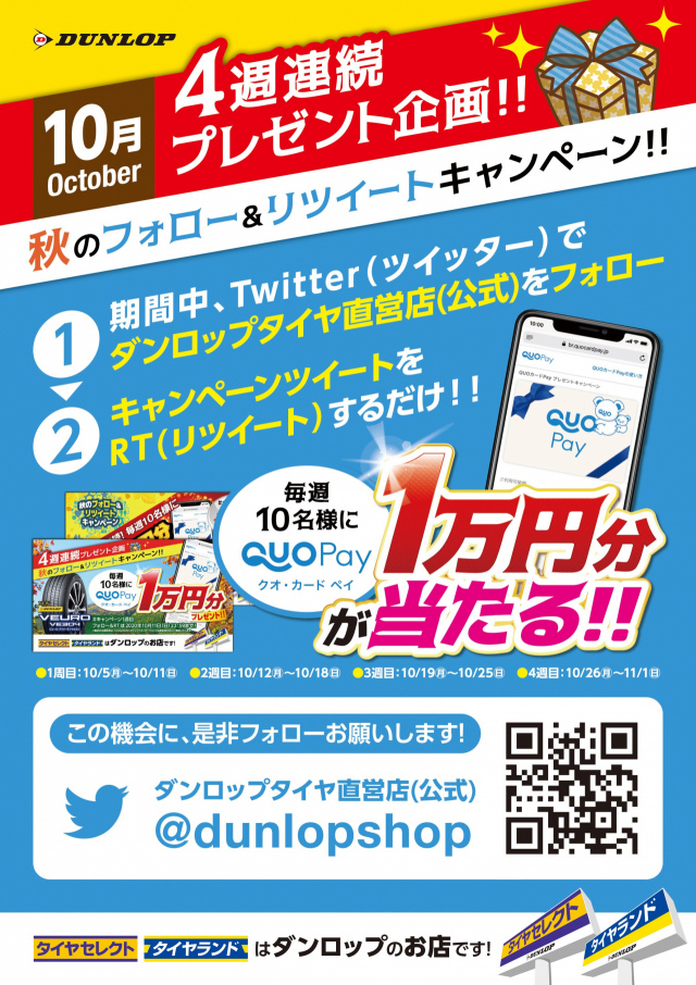 こんにちは。タイヤセレクト上越です。 いつもご利用ありがとうございます。 当店はダンロップタイヤの直営店です。 実は公式SNSが存在しています! 今月は4週連続でプレゼントがもらえるチャンスがあります。 ・1...