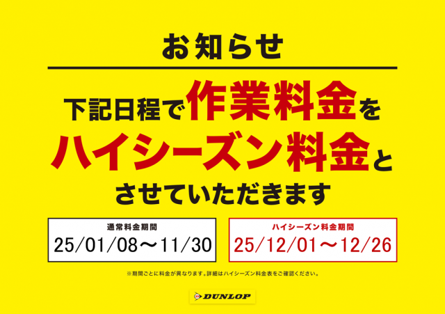 いつも当店をご利用いただき誠にありがとうございます。 作業集中緩和の為、12月1日~12月末日の間、 タイヤの脱着を含む作業料金をハイシーズン料金とさせていただきます。 料金につきましては店頭スタッフにお問い合...