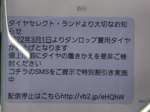 【豊田のタイヤセレクト】 SMS特別割引実施中!! こんにちは!水無瀬です! 2月中限定で SMS特別割引を実施中です!! ご利用方法は ↓のSMS画面を提示いただくだけです! ※必ず商談前にSMS画面をお見せください! ※他の割引と同時利用はできません! タイヤ交換をご検討中のお客様 今月中は値上げ前価格 でご購入いただけます! ご来店・お問合せお待ちしております!! 2022.02.11