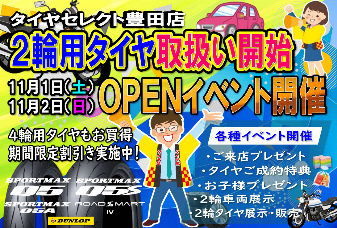 【豊田のタイヤセレクト】《バイクタイヤ取り扱い開始記念》OPENイベント実施中!!!