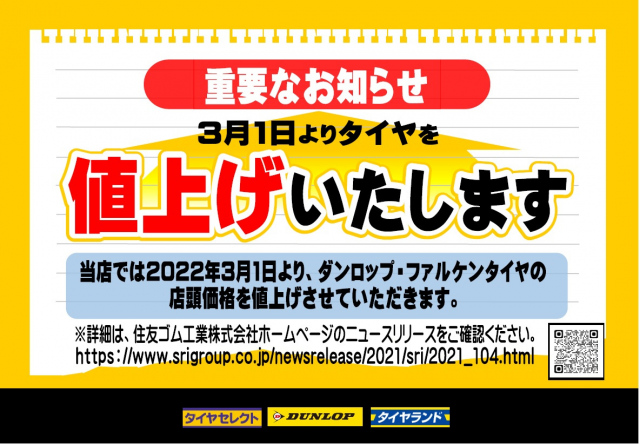 昨年、住友ゴム工業株式会社よりタイヤ価格の値上げ発表がありました。