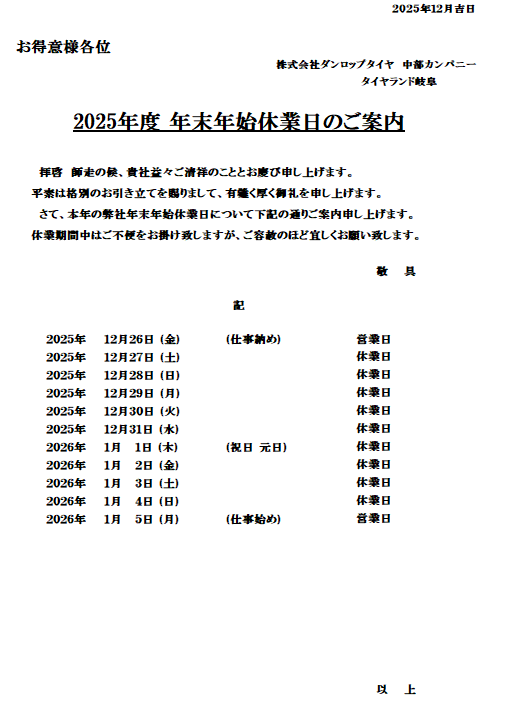 年内は12月26日までとなっておりますので宜しくお願い致します。