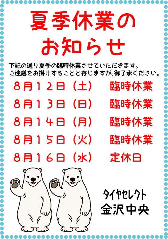 今日は、遅くなりましたが【夏季休業のお知らせ】です