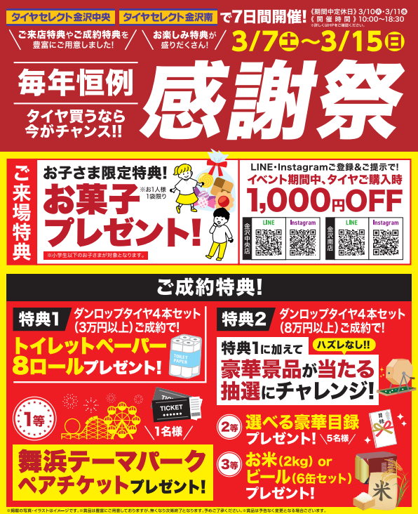 ダンロップタイヤ4本税別3万円以上お買上で…
