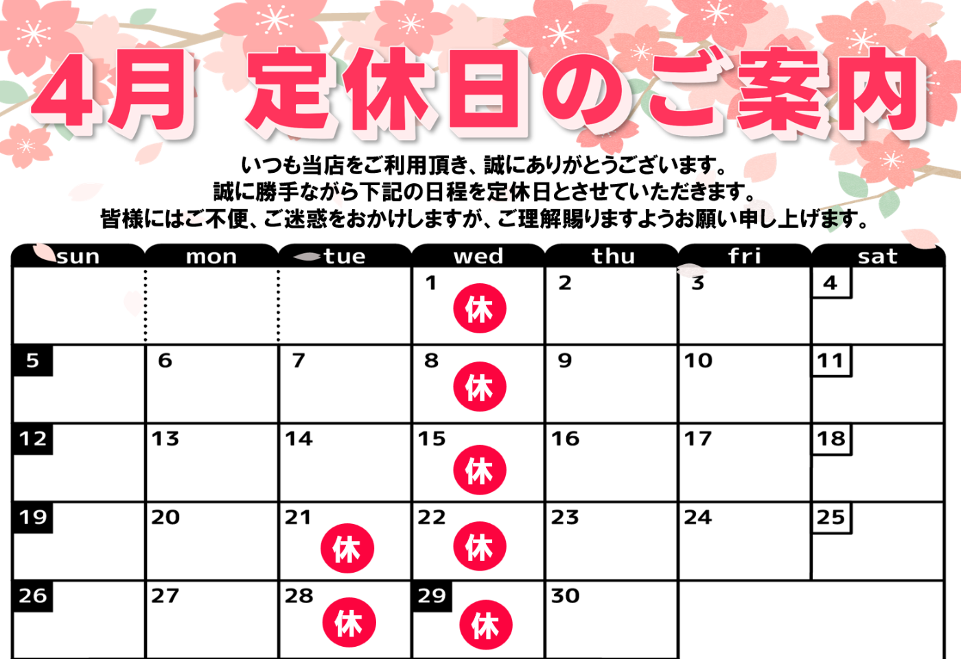 誠にありがとうございます。3月の休業日は下記のとおりです