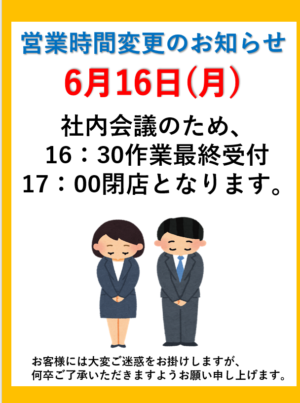 6月16日 営業時間のお知らせ