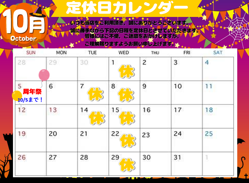 誠にありがとうございます。10月の休業日は下記のとおりです