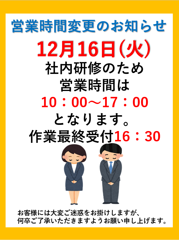 12月16日 営業時間のお知らせ