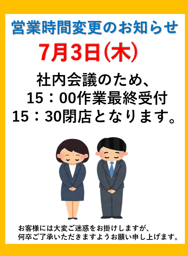 □■━━━━━━━━━━━━■□ 7月3日 営業時間のお知らせ □■━━━━━━━━━━━━■□ いつも当店をご利用いただき 誠にありがとうございます。 7月3日(木)社内会議のため 営業時間を変更させていただきます。 ...