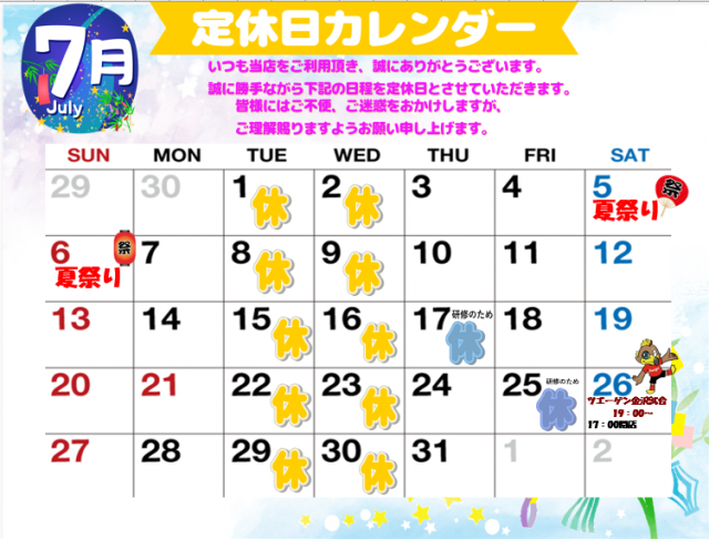 □■━━━━━━━━━━━━■□ 7月 休業日のお知らせ □■━━━━━━━━━━━━■□ いつも当店をご利用いただき 誠にありがとうございます。 7月の休業日は下記のとおりです 皆様にはご不便、ご迷惑をおかけしま...