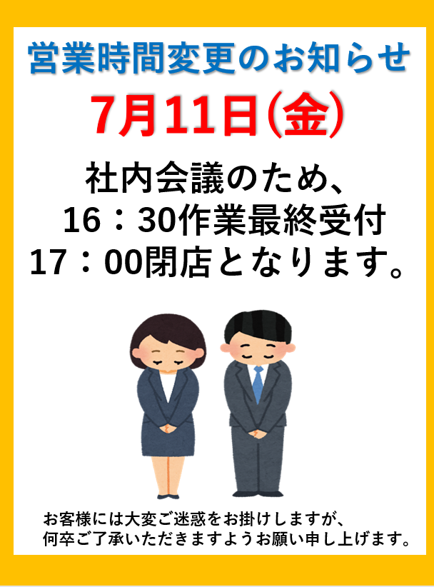 □■━━━━━━━━━━━━■□ 7月11日 営業時間のお知らせ □■━━━━━━━━━━━━■□ いつも当店をご利用いただき 誠にありがとうございます。 7月11日(金)社内会議のため 営業時間を変更させていただきます。 &nbs...