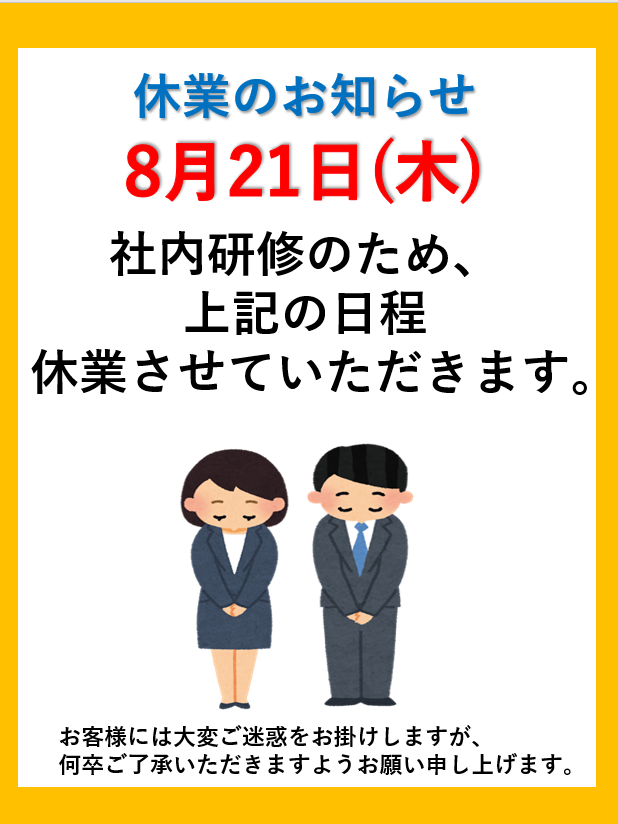 □■━━━━━━━━━━━━■□ 8月21日 営業時間のお知らせ □■━━━━━━━━━━━━■□ いつも当店をご利用いただき 誠にありがとうございます。 8月21日()社内会議のため 休業させていただきます。 ...