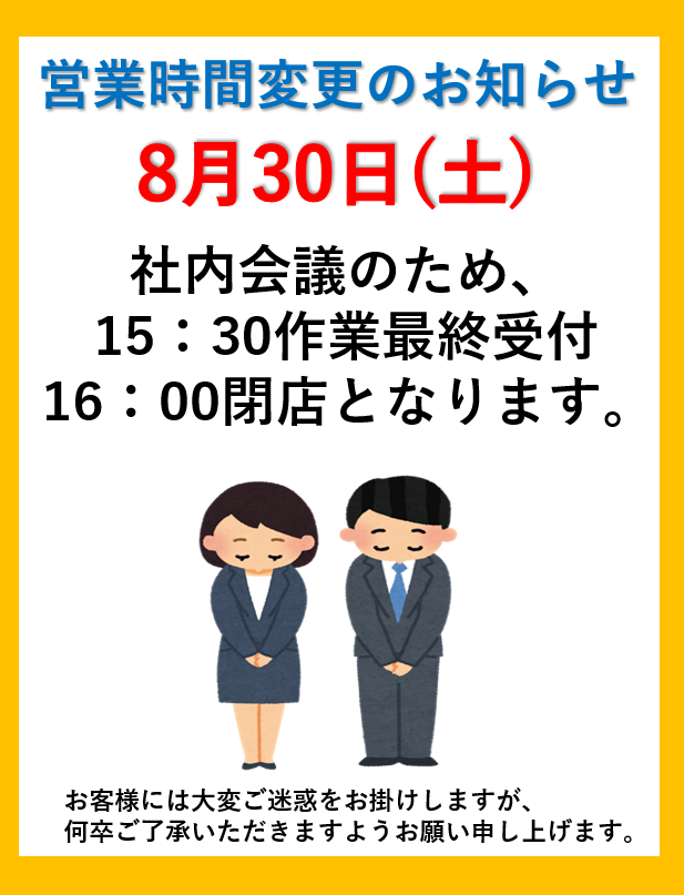 □■━━━━━━━━━━━━■□ 8月30日 営業時間のお知らせ □■━━━━━━━━━━━━■□ いつも当店をご利用いただき 誠にありがとうございます。 8月30日(土)社内研修のため 営業時間を変更させていただきます。 &nbs...