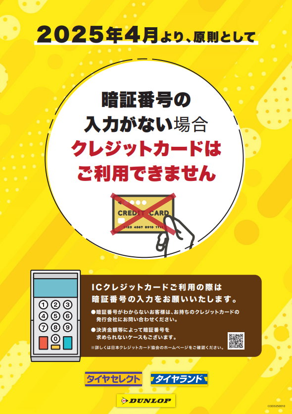 2025年4月1日より暗証番号の入力が無い場合、クレジットカードでのお支払いが出来なくなります。