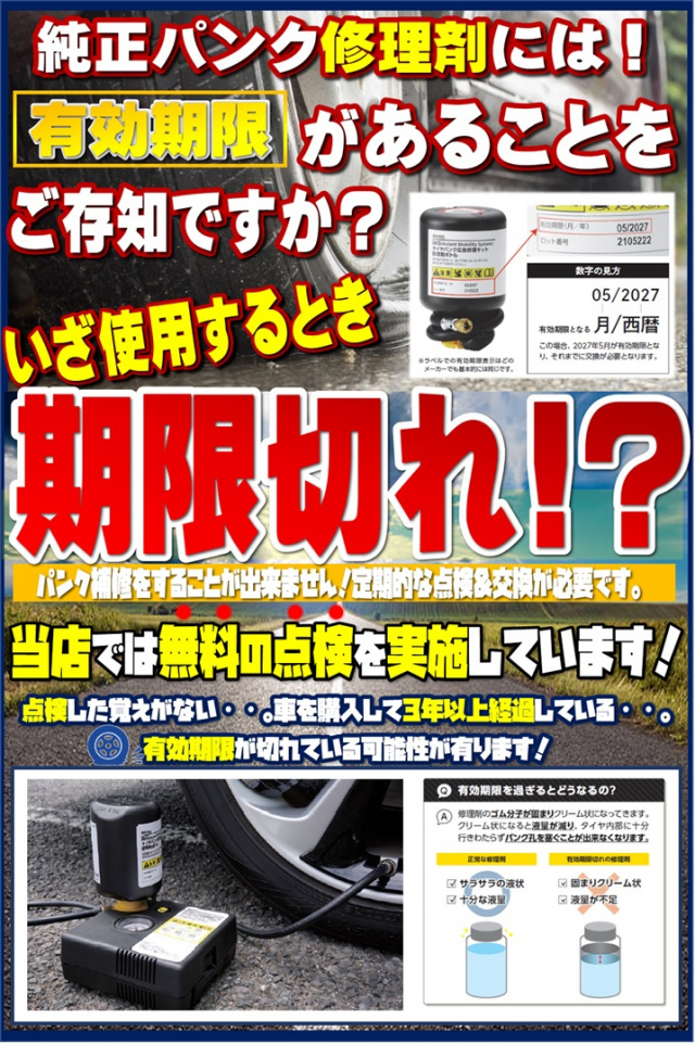 お車に搭載されているパンク修理キットの有効期間があることはご存知ですか?