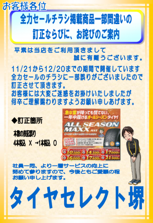 本日11月21日(土)~12月20日(日)今年最後の全力セール開催いたします。