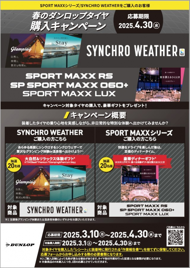春のダンロップタイヤキャンペーン・・ 春のダンロップタイヤ購入キャンペーンのお知らせです☆ SPORT MAXXシリーズ/SYNCHRO WEATHERをご購入のお客様 抽選で豪華ギフトをプレゼント! 今月迄ですよ~~ お早めに! 2025.04.25