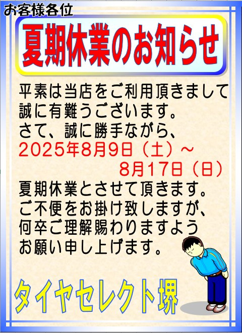 夏期休暇のご案内 8月9日(土)から8月17日(日) 8月18日(月)より通常通り営業致します。 ご不便おかけしますが、宜しくお願いします。