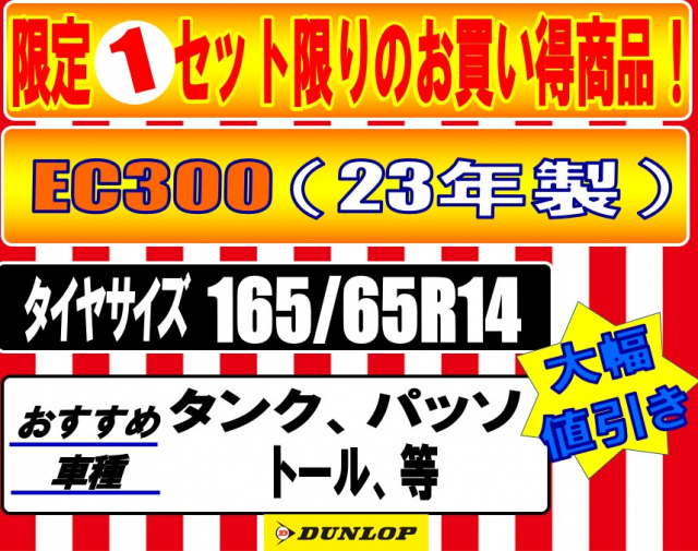 アウトレット品のご案内です!! サイズは165/65R14 EC300 新車装着用タイヤです。 車種ではトヨタ タンク、ルーミー、パッソやダイハツ トール等です。 通常価格よりかなりお買い得なので、気になった方!是非一度お...