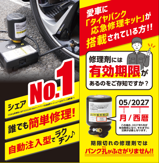 タイヤのパンク応急修理キットってご存知ですか? 最近の車両にはスペアタイヤが搭載されていないケースが多くなってきました。 その代わりに先の様な修理キットが搭載されています。 こちらのキットの修理剤には有効...