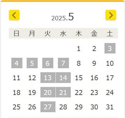 5月の定休日のご案内 ゴールデンウィークの期間、5月3日から5月7日迄 上記以外では毎週火曜日と14日、21日の水曜日を 定休日とさせて頂きます。 ご不便をおかけしますが、宜しくお願いします。