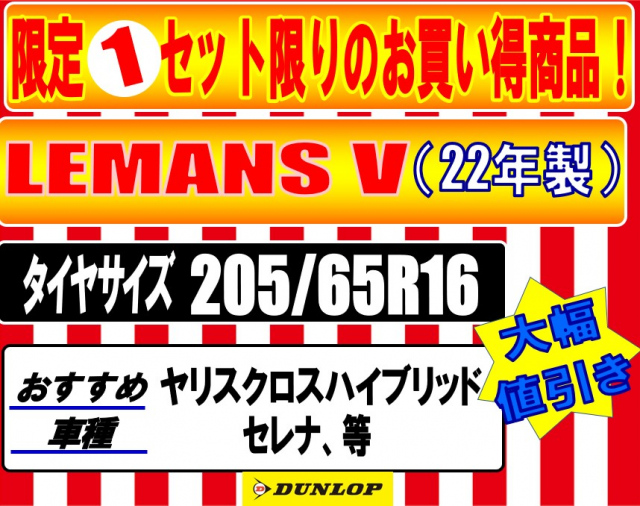 お買い得品(アウトレット品)のご案内です。 205/65R16 LM5 22年製 が限定1セットのみでの ご案内です。 通常よりかなりお買い得となっておりますので 気になった方!是非一度ご来店下さいませ~~