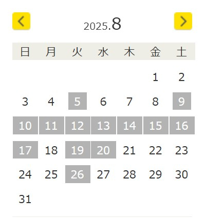 8月の定休日、お盆休暇のご案内。 毎週火曜日、20日の水曜日、 お盆休暇、9日(土)~17日(日)になります。 ご不便お掛けしますが、宜しくお願いします。