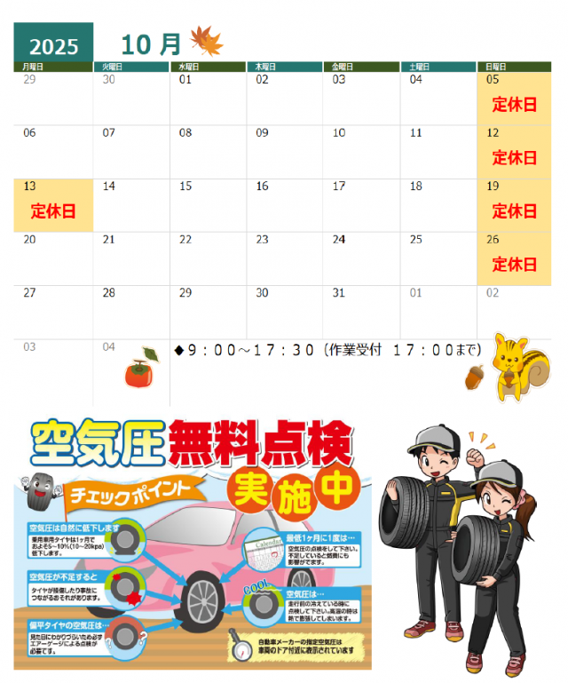 こんにちは! アクセスありがとうございます。 タイヤランド岸和田です 11月の定休日案内 になります。 よろしくお願い致します。 ※オイル交換は11月末まで。 (12月はタイヤ交換繁忙期の為ご了承...