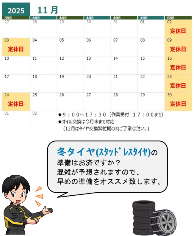 11月の定休日のご案内 こんにちは! アクセスありがとうございます。 タイヤランド岸和田です 11月の定休日案内 になります。 よろしくお願い致します。 ※オイル交換は11月末まで。 (12月はタイヤ交換繁忙期の為ご了承ください。) 2025.10.29