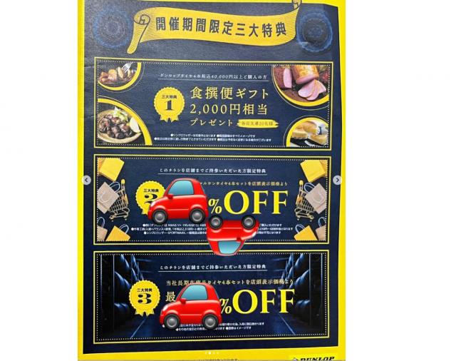 タイヤ4本万円以上ご購入の方先着20名様に、食撰便ギフト2000円相当をプレゼント!