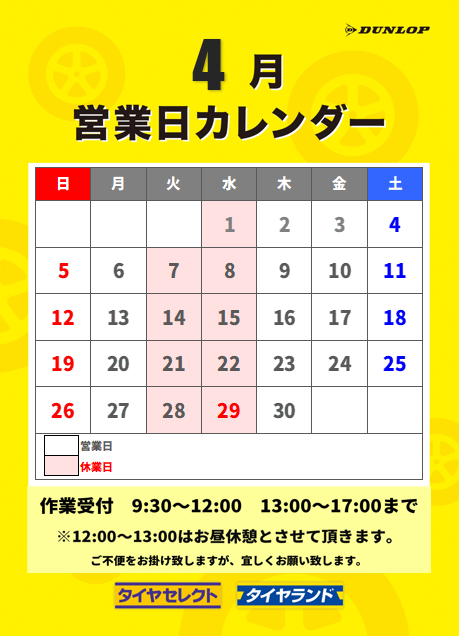 4月定休日のお知らせ タイヤセレクト堅田のHPにアクセスありがとうございます。 4月の定休日は、毎週火曜日・水曜日となっております。 ご利用のお客様にはご不便をお掛けしますが、宜しくお願い致します。 2026.04.01