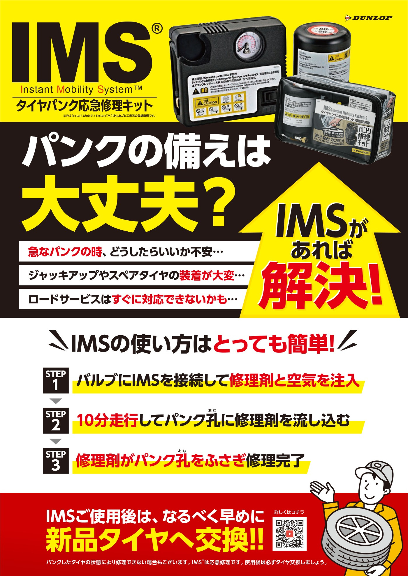 スペアタイヤへの交換が大変・・ロードサービスがすぐに来てくれない・・そんな時でもダンロップのタイヤパンク応急修理キット【IMS】があれば安心です!突然のパンクにはIMSで備えることをおすすめします。