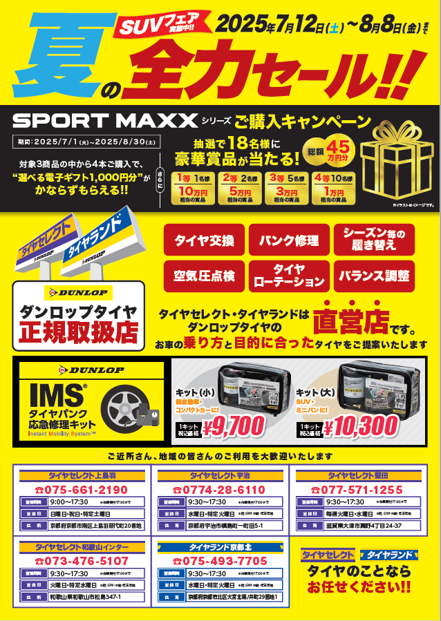 夏の全力セール開催中です! タイヤセレクト堅田のHPにアクセスありがとうございます。 現在開催中の夏の全力セール!は2025年8月8日まででございます! タイヤ点検、空気圧チェックだけでも大歓迎ですので、お出かけ前にぜひお立ち寄りくださいませ。 2025.07.26
