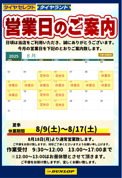 8月定休日のお知らせ タイヤセレクト堅田のHPにアクセスありがとうございます。 8月の定休日は、毎週火曜日・水曜日、9日~17日となっております。 ご利用のお客様にはご不便をお掛けしますが、宜しくお願い致します。 2025.08.01
