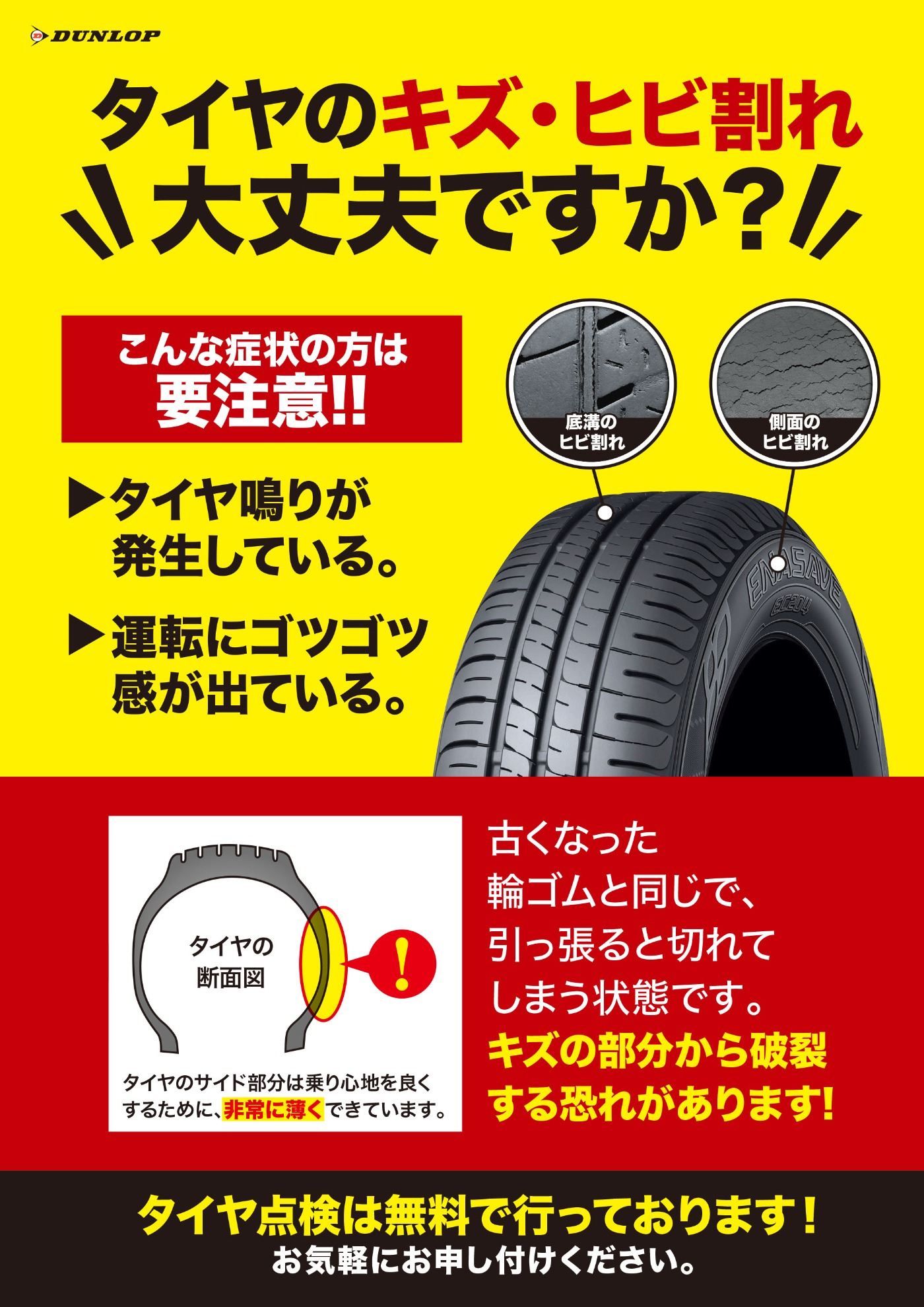 タイヤの状態は定期的にチェックしておられますか。空気圧はもちろんですが、溝が減っているタイヤやひび割れしているタイヤは性能が大きく低下します。当店ではタイヤの無料安全点検を行っております。