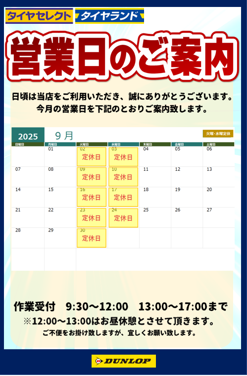 9月定休日のお知らせ タイヤセレクト堅田のHPにアクセスありがとうございます。 9月の定休日は、毎週火曜日・水曜日となっております。 ご利用のお客様にはご不便をお掛けしますが、宜しくお願い致します。 2025.09.01