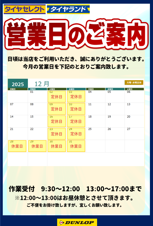 12月定休日のお知らせ タイヤセレクト堅田のHPにアクセスありがとうございます。 12月の定休日は、毎週火曜日・水曜日・28日~31日となっております。 ご利用のお客様にはご不便をお掛けしますが、宜しくお願い致します。 2025.12.01