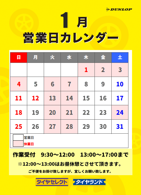 1月の定休日は、1日~4日・毎週火曜日・水曜日・24日(土)となっております。