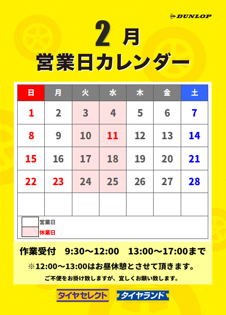 2月定休日のお知らせ タイヤセレクト堅田のHPにアクセスありがとうございます。 2月の定休日は、毎週火曜日・水曜日となっております。 ご利用のお客様にはご不便をお掛けしますが、宜しくお願い致します。 2026.02.01