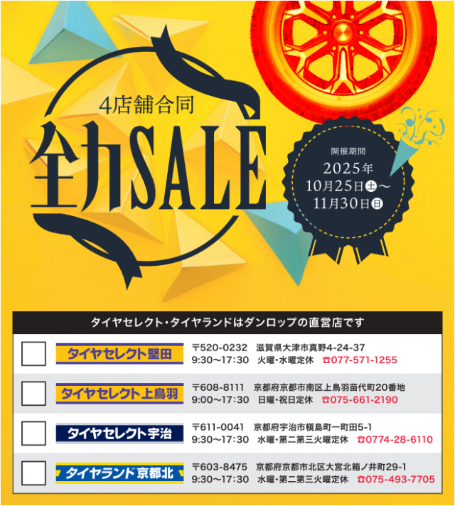 緊急事態宣言の解除が発表されたことを受け、当該エリアのタイヤセレクト・タイヤランド(直営店)におきましては、順次、通常営業を再開いたします。 お客様及び従業員の安全を第一に考え、予約制の導入や接客時間の短縮をはかることで、お客様同士の距離の確保や、スタッフとの接触機会を最小限に心がけるなどの感染防止に努めてまいります。 (店内には消毒液を設置しております。また換気、テーブル等の消毒も実施しております。) 詳細は「 お知らせ」をご確認ください。 ご不便やご迷惑をおかけいたしますが、何卒宜しくお願い申し上げます。