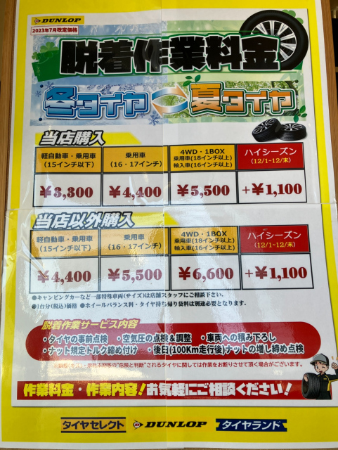 こんにちは。 来月12月は脱着料金が 『ハイシーズン料金』 となります、ご協力をお願い致します。