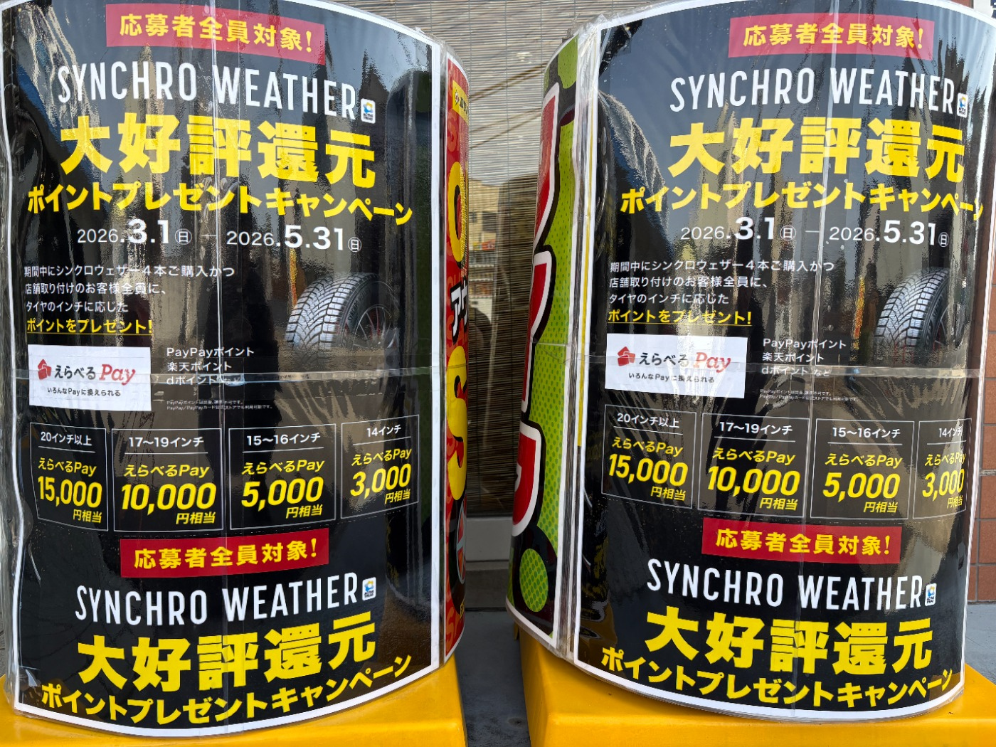 ポイントプレゼントキャンペーン! こんにちは。 シンクロウェザー購入をし 取り付け作業が完了したお客様全員に ポイントをプレゼント!! 本日より5月31日まで 詳しくは店頭にて。 ご来店お待ちしております。 2026.03.01
