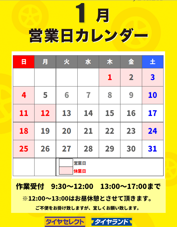 タイヤランド田原本です! 明日、2026年1月24日(土)は社内研修のため、休業日となります。 ご来店の際はご注意ください。 ご不便をおかけいたしますがよろしくお願いいたします。