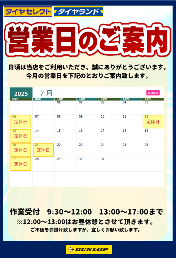 2025年7月の休業日案内になります こんにちはタイヤランド田原本です! 6月も早いもので最終日となりました! 来月、7月の休業日案内を掲示させていただきますので ご来店の際はご確認ください 2025.06.30