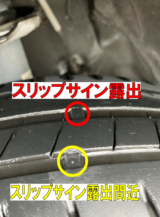 写真のようにタイヤの溝の底に凸の形状があり、これがスリップサインです。表面に露出すると残溝1.6mm以下であるといった基準なのですが、露出するまで使っても大丈夫!というわけでもなく表面に近づくにつれ