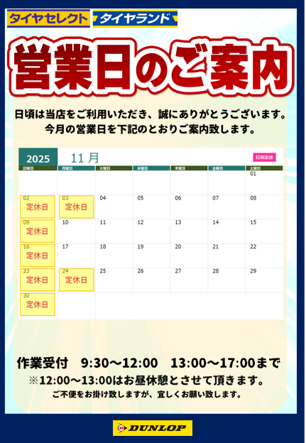 2025年11月の店休日になります タイヤランド田原本です!! 今月もたくさんのお客様にご来店いただきありがとうございます! 早速ですが来月11月の休日の案内をさせていただきます。 ご来店の際は確認していただきますようお願いいたします・・。 2025.10.31