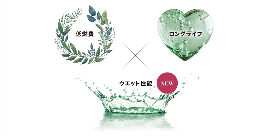EC204で好評だった基本的な「低燃費性能」、「ロングライフ(耐摩耗性能)」はそのままに、新たにウエット性能 の向上を実現しました!!